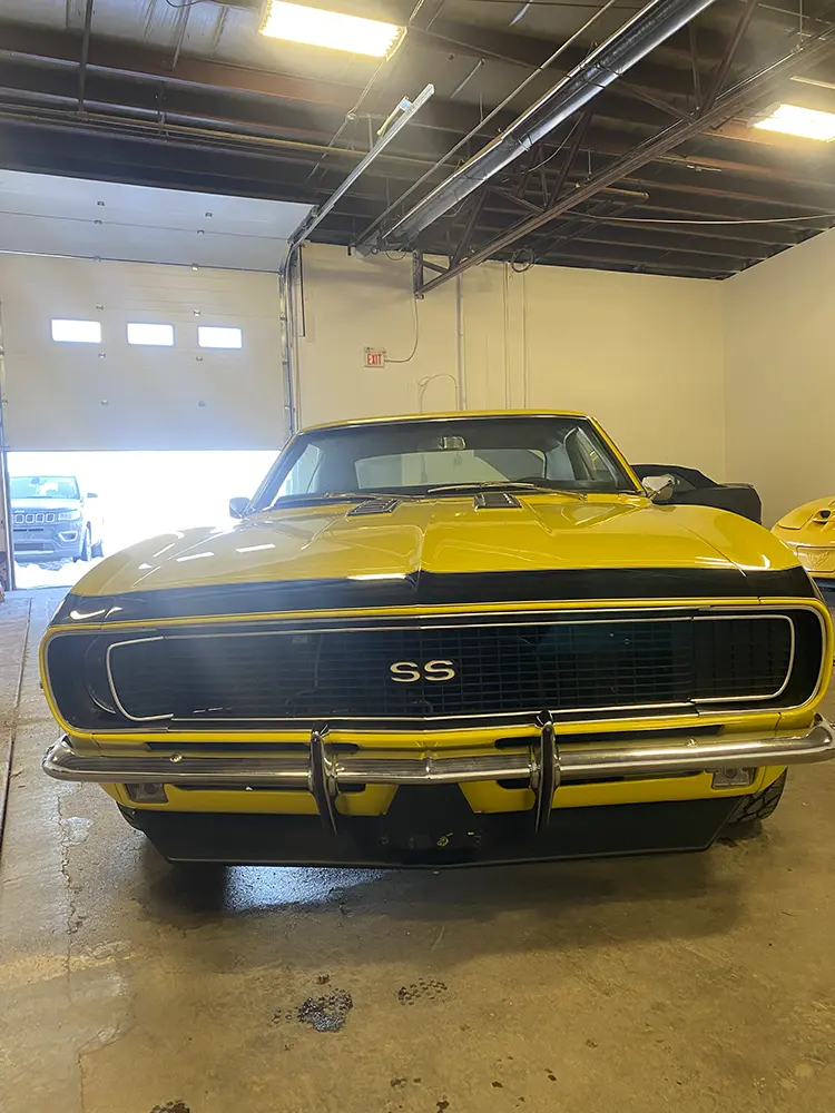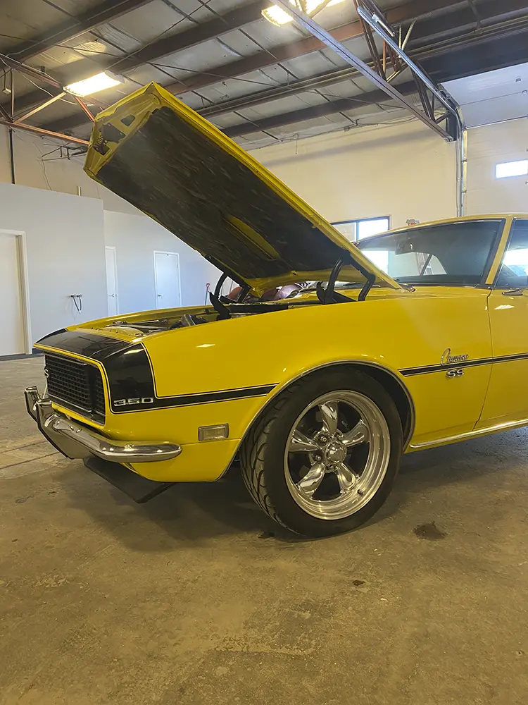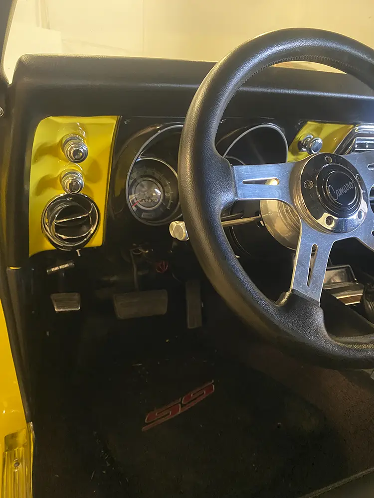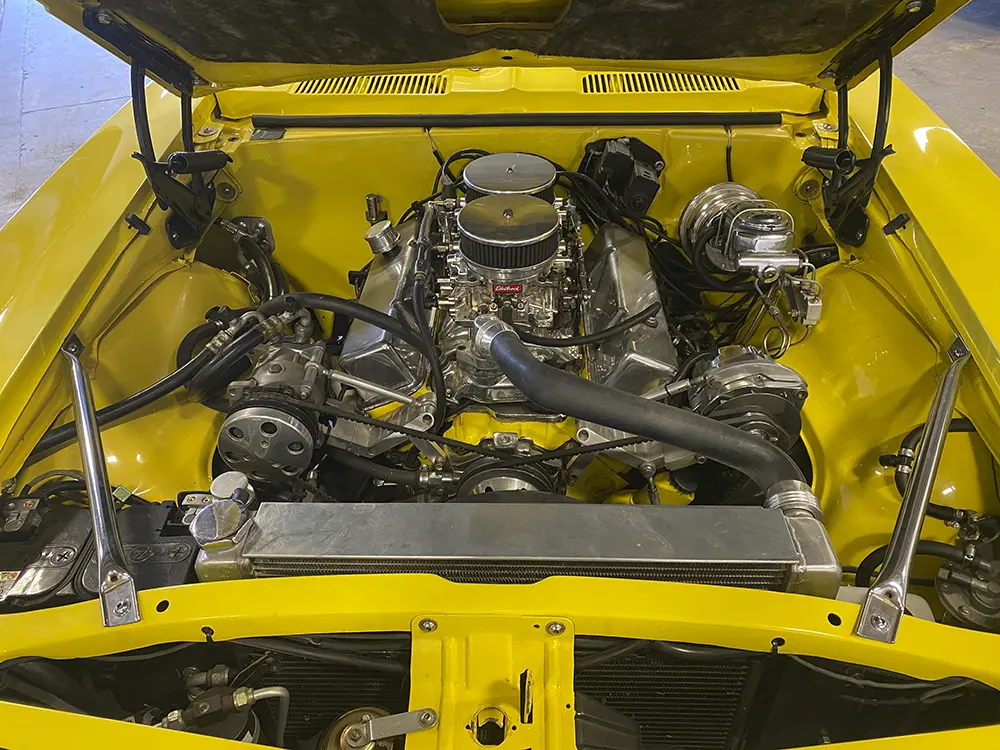 SBC 350 V-8, dual 4BL carbs, powering steering, disc brakes, 10 bolt limited slip rear-end, tilt steering, custom steering wheel, consol with gauge package, Alloy wheels, billet accessories, aftermarket shifter, air conditioning.