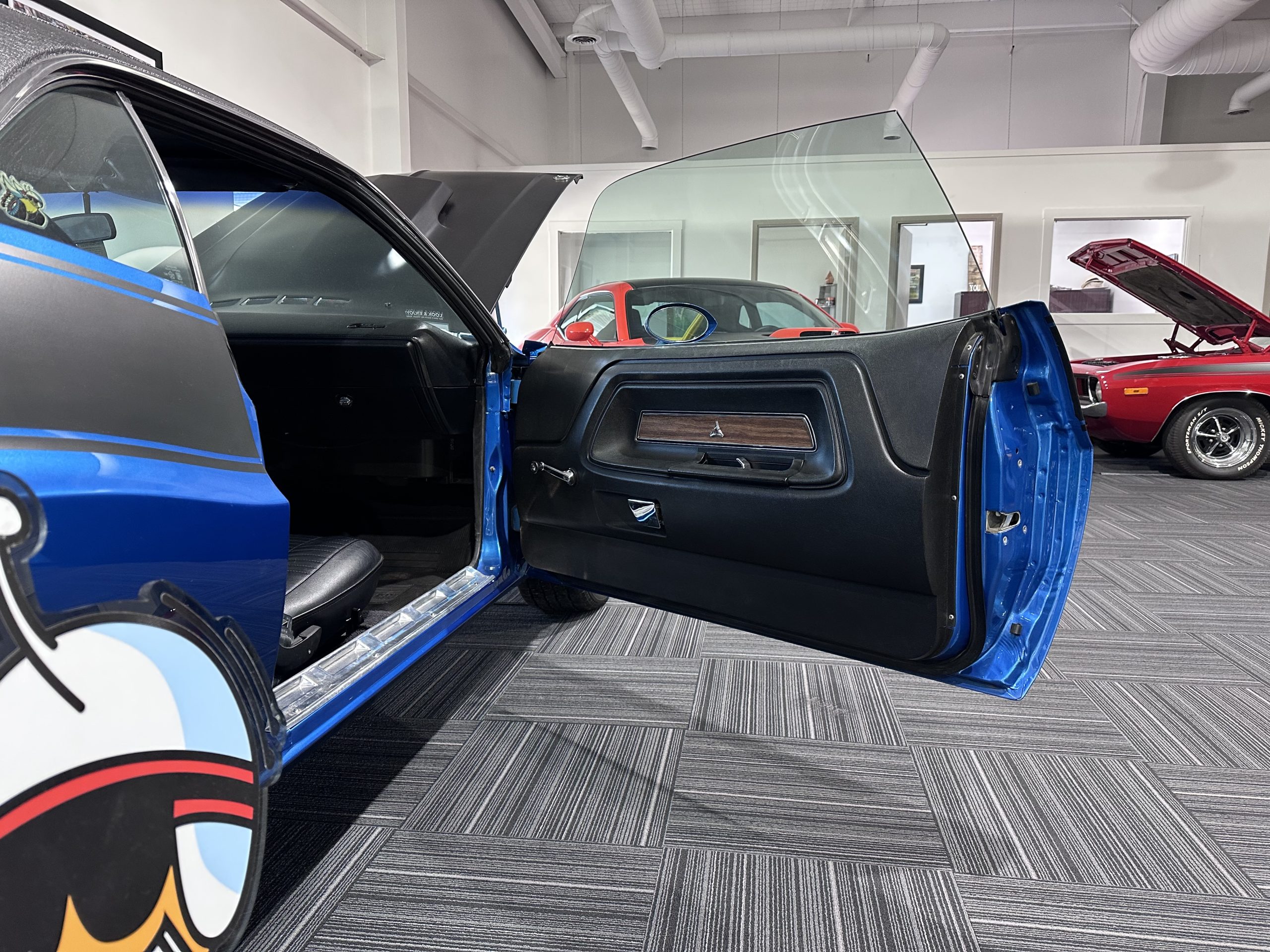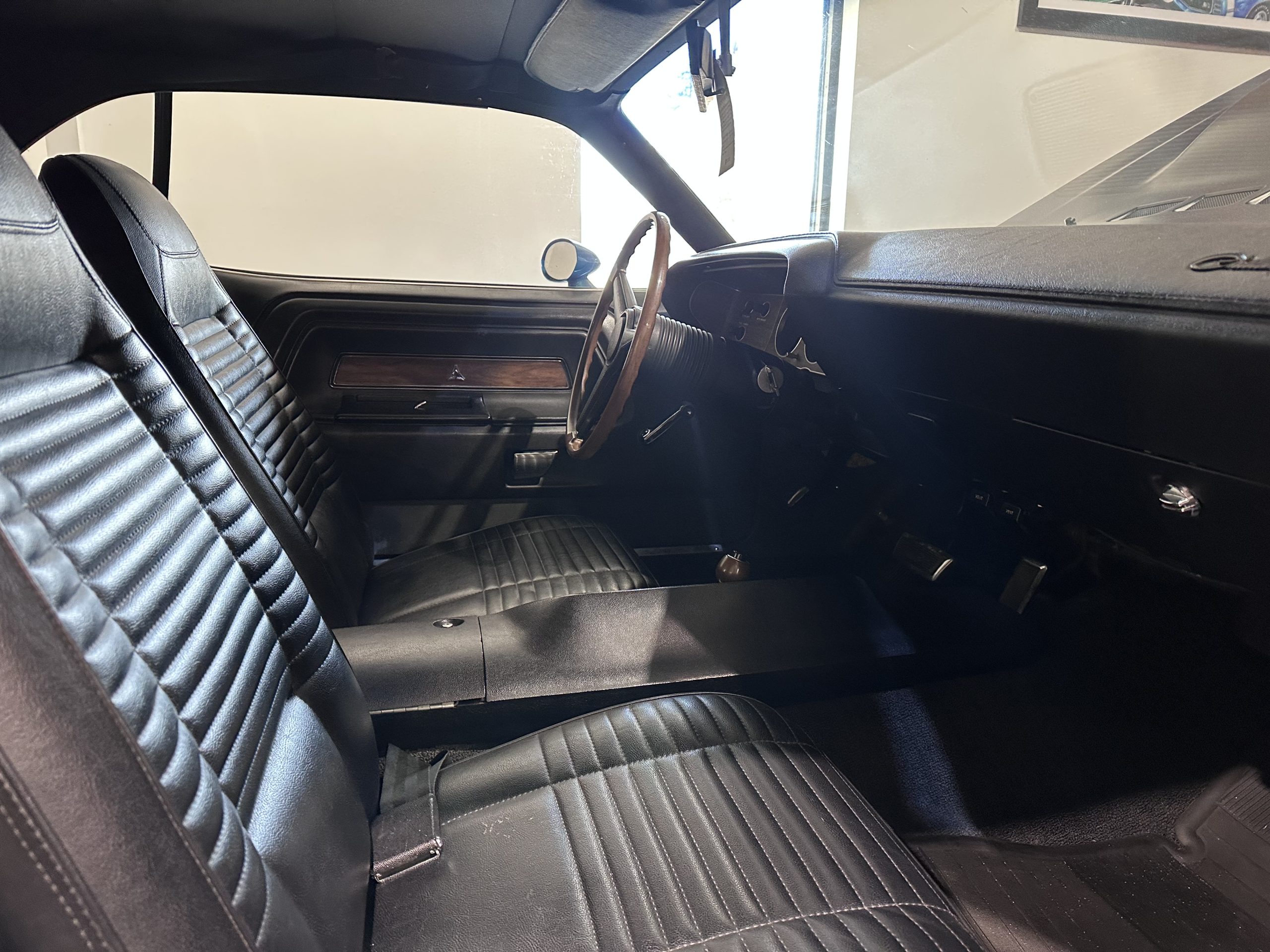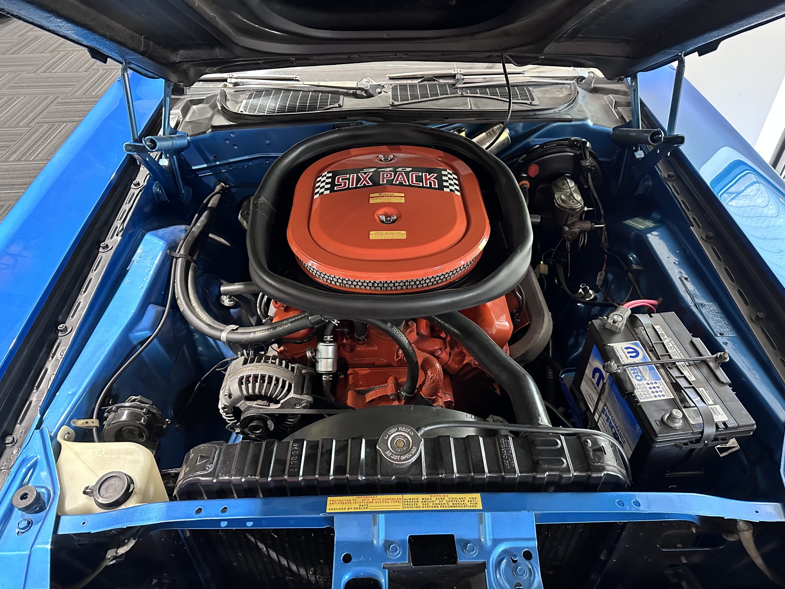 Special 340 6-BBL 4 speed manuel, Power disc front brakes/rear drums, ralleye suspension w/front and rear sway bars, 3.55 ratio             8.75″ sure Grip rear end, black fiberglass performance hood w/carb air intake scoop.